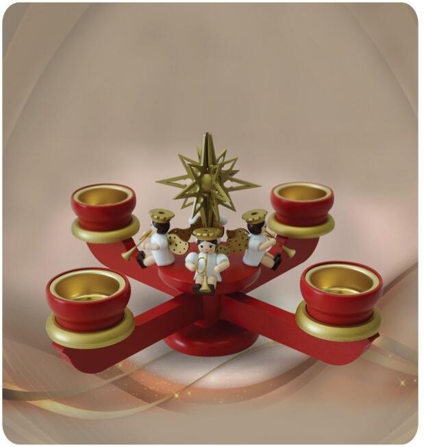 Vier Arme mit eleganten Holztüllen tragen Pyramidenkerzen sicher dank der robusten Metalleinsätze. Der handgefertigte Adventsleuchter wird in mehreren Arbeitsschritten im traditionsreichen Seiffen im Erzgebirge hergestellt und steht für die hohe Kunst des Handwerks aus dieser Region.