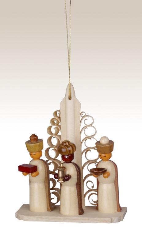Diese edle Miniaturfigur präsentiert die Heiligen drei Könige in ihrer vollen Pracht. Die natürliche Holzstruktur und die meisterhafte Handarbeit machen jedes Exemplar einzigartig. Mit einer Höhe von ca. 10 cm fügt sich dieser Baumbehang perfekt in jede Weihnachtsdekoration ein. Der Anhänger ist mit einem filigranen Spanbaum und einem praktischen Faden zum Aufhängen versehen. Diese Figur bringt den Zauber des Erzgebirges direkt in Ihr Zuhause und verleiht Ihrem Christbaum oder Adventsgesteck einen besonderen Charme.