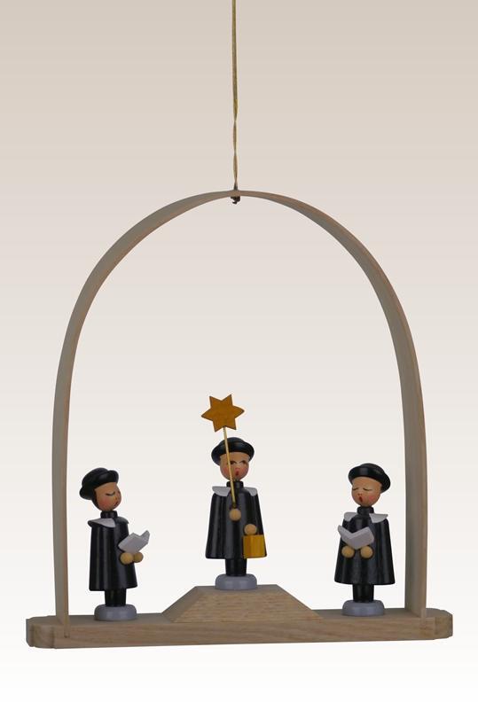 Erleben Sie den zauberhaften Baumbehang mit drei liebevoll gestalteten Kurrendefiguren im farbenfrohen Bogen. Die filigrane Holzarbeit ist komplett in Seiffen im Erzgebirge gefertigt und bringt traditionelle Handwerkskunst direkt zu Ihnen nach Hause. Dieser kunstvolle Christbaumschmuck wird in Ihrer Weihnachtsdeko zum Blickfang. Der bunte Anhänger eignet sich perfekt, um sowohl klassische als auch moderne Weihnachtsbäume stilvoll zu dekorieren.