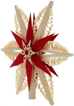 Dieser kunstvoll gestaltete Spanstern verbindet traditionelle erzgebirgische Handwerkskunst mit filigraner Eleganz. Sechs von Hand gestochene Spanbäume, ergänzt durch leuchtend rote Kiefernholzsegmente, formen ein harmonisches Sternmotiv, das durch seine feinen Details und präzise Verarbeitung besticht.