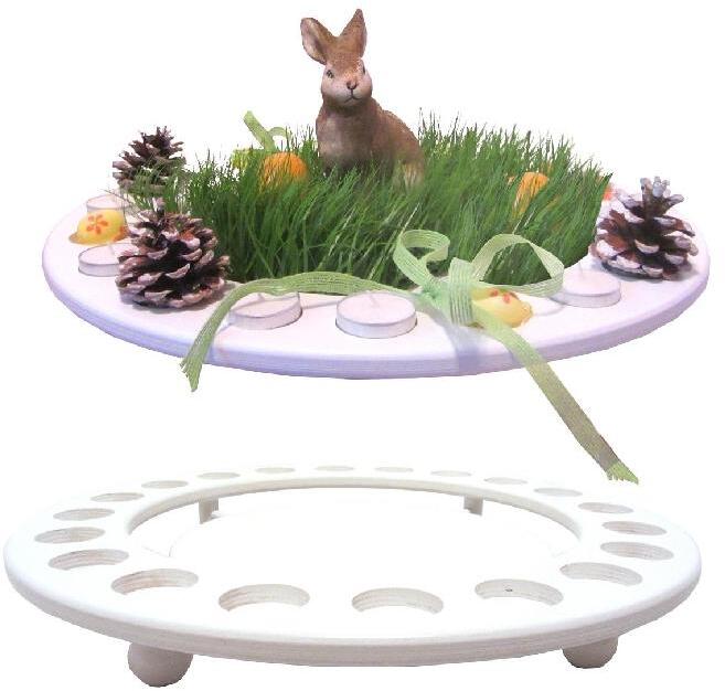 Der tolle Teelichthalter mit einem Außendurchmesser von 45 cm und einer Höhe von 6,5 cm ist ein filigran gefertigtes Kunstwerk aus dem Erzgebirge. In seinem Außenkranz finden bis zu 20 Teelichter Platz, während die Innenfläche individuell dekoriert werden kann. Die weiß lackierte Oberfläche verleiht dem Teelichthalter eine elegante und zeitlose Ausstrahlung.