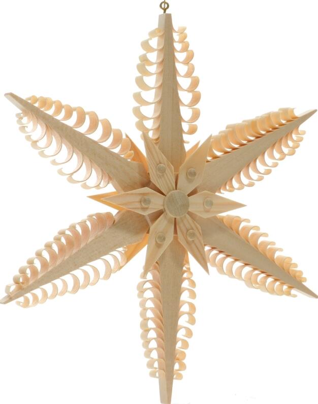Dieser handgefertigte Spanstern entfaltet seine Schönheit besonders eindrucksvoll, wenn Licht auf die filigranen Spanbäume und die kunstvoll geschnittenen Holzsternsegmente trifft. Die natürliche Holzstruktur reflektiert das Licht sanft und sorgt für eine warme, einladende Atmosphäre. Innerhalb der Kategorie