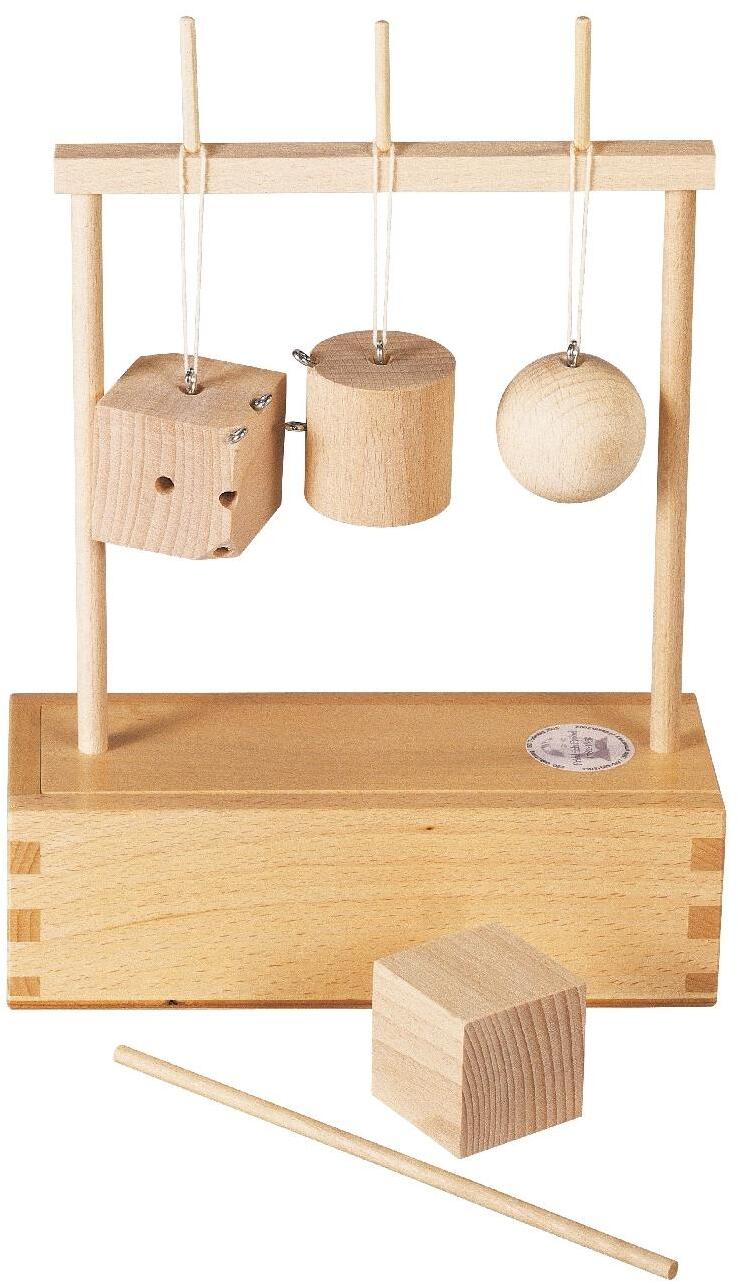 • Aus der 2. Gabe: Kugel, Walze und Würfel, aufhängbar an Ösen, mit Durchbohrungen zur Einführung von Stäbchen