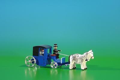Romantische Szene voller Nostalgie entsteht auf kleinem Raum. Miniatur Brautkutsche mit Pferdegespann erinnert an festliche Hochzeitsfahrten und historische Dorfkultur. Blick bleibt an filigranen Rädern, Pferd und Kutsche hängen.