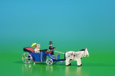 Filigranes Miniatur Kutschengespann mit offenem Aufbau