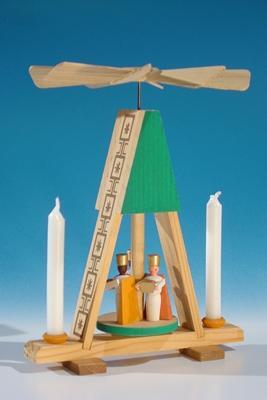 Miniatur Wärmespiel-Pyramide – Drei Könige in Grün naturfarbene Holzkonstruktion für Puppenkerzen