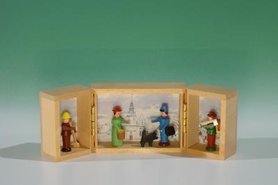Miniatur im Klappkästchen ihren besonderen Reiz. Kleine Kunstwerke erzählen Geschichten aus erzgebirgischen Dörfern. Postbote auf winterlichem Weg erinnert an ruhige Tage voller Schnee, knirschende Schritte und warmes Licht aus Fenstern.