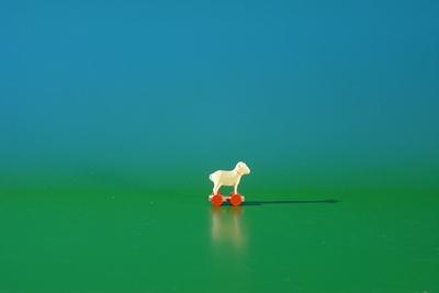 Platzieren Miniaturfigur Schaf auf Holzrädern neben Stall, auf Weide oder zwischen weiteren Tieren. Gestalten harmonische Szene mit ruhigem, natürlichem Charakter.