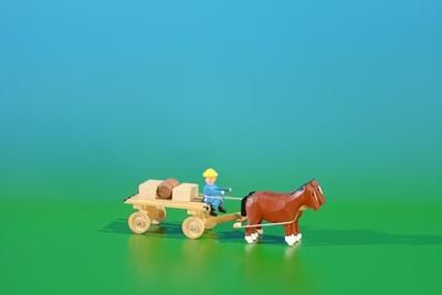 Diese kleine Szene traditioneller Transportarbeit bringt ursprüngliche Erzgebirgsatmosphäre in den Wohnraum. Ein Pferd zieht den Lattenwagen ruhig über Feldwege und erinnert an frühere Arbeiten auf Bauernhöfen.