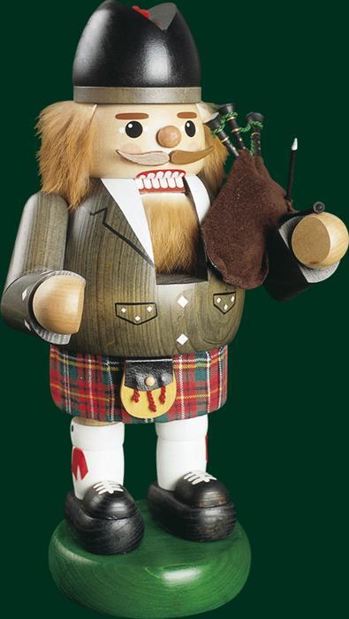 Dieser Nussknacker Schotte erzählt Geschichten längst vergangener Tage. Sein schottisches Outfit, bestehend aus Glengarry-Mütze, Jacke und Kilt, ist detailgetreu gestaltet. In den Händen hält er einen kunstvoll verzierten Dudelsack.