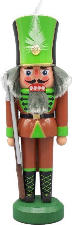 Dieser Nussknacker Soldat überzeugt durch seinen kraftvollen Ausdruck und die hochwertige Verarbeitung. In traditioneller Uniform mit braunem Mantel, grünem Hut und aufgesetztem Gewehr bringt er klassische Weihnachtsstimmung in Ihr Zuhause.