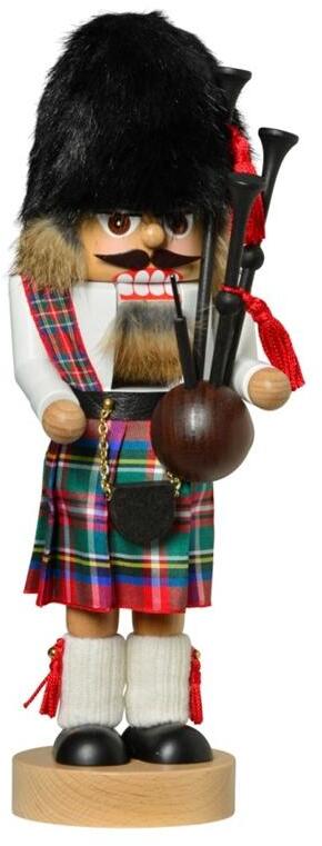 Der Nussknacker Schotte fasziniert durch seine detaillierte Gestaltung und die hochwertige Verarbeitung von Holz und Fell. Die schwarze Fellmütze sitzt stolz auf seinem Kopf und bildet einen schönen Kontrast zu den bunten Farben seiner Uniform. Der Dudelsack in seinen Händen unterstreicht seine schottische Herkunft und bringt einen Hauch von Highlands in Ihre Weihnachtsdekoration.