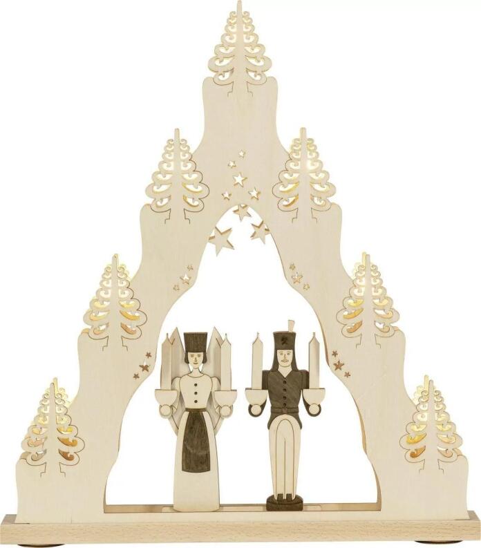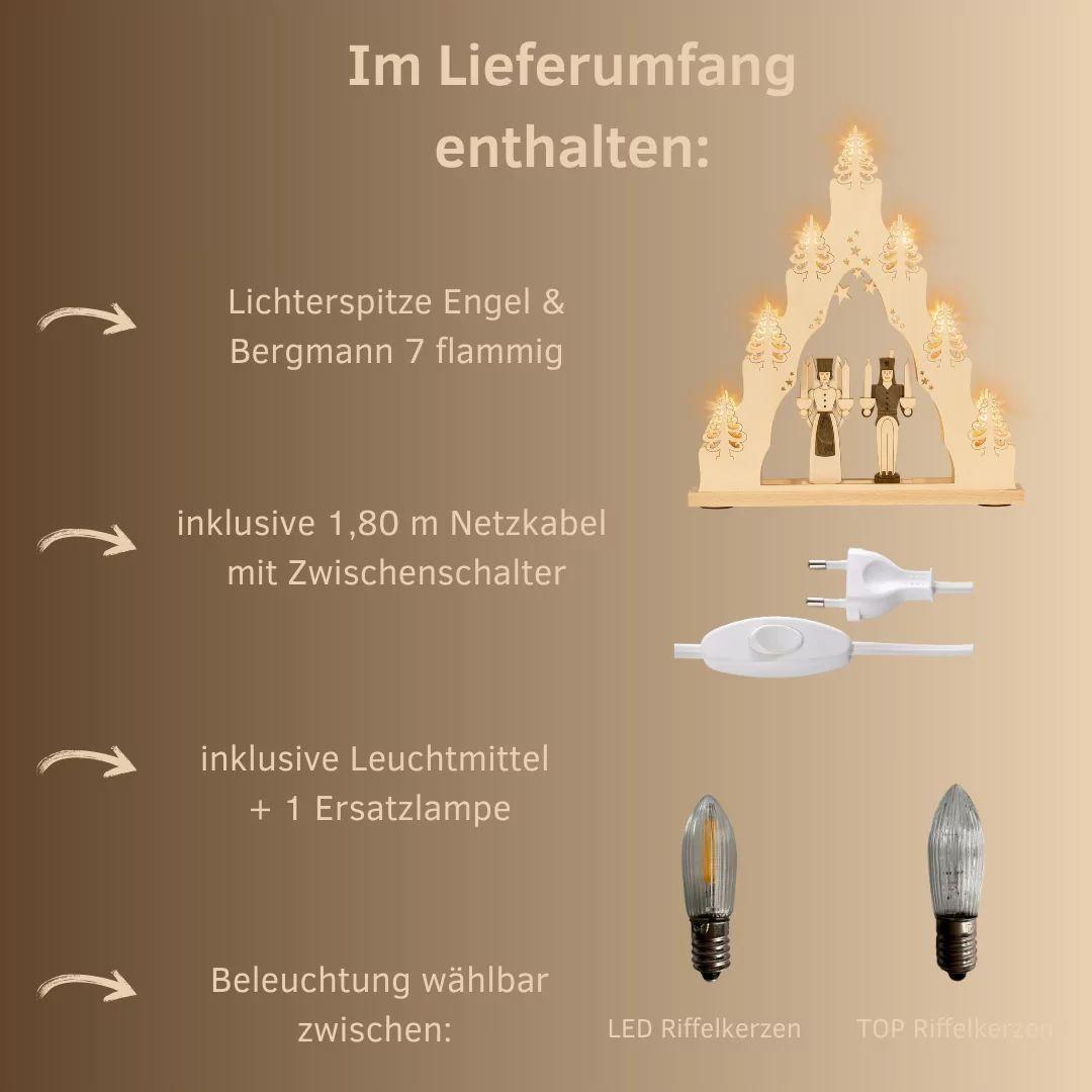 Schwibbogen Engel & Bergmann mit LED-Beleuchtung natur Der Schwibbogen gehört im Erzgebirge zum traditionellen Kunsthandwerk wie der Nussknacker oder der Räuchermann. Mit dem Schwibbogen Engel & Bergmann können Sie sich so einen traditionellen Artikel nach Hause holen. Der Schwibbogen besteht aus zertifiziertem Sperrholz. Beleuchtet wird das Ganze mit 7 LED-Riffelkerzen 230 V mit Kabel, Schalter und Stecker. Größe 43 cm. BxHxT 38,0x43,0x4,5cm NEU