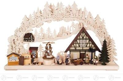 Entdeckungsreise ins Erzgebirge: Schwibbogen Weihnachtsmarktbau groß, indirekt elektrisch beleuchtet – Höhe ca. 43 cm