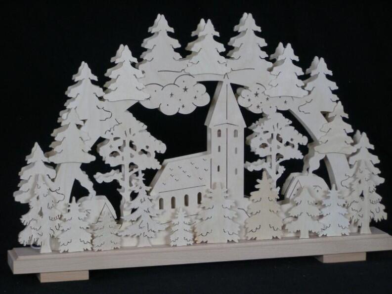 Tauchen Sie ein in eine Welt voller Detailverliebtheit und künstlerischem Handwerk. Der Schwibbogen zeigt eine wunderschöne Silhouette eines Dorfes mit Kirche und Häusern, meisterlich aus hellem Holz gesägt. Jede Kontur, jedes Detail der Szenerie wird bei eingeschalteter Beleuchtung stimmungsvoll hervorgehoben. Das warme Licht durchflutet die Räume und schafft eine gemütliche Atmosphäre, die besonders zur Weihnachtszeit verzaubert.