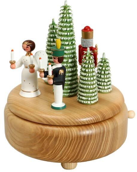 Diese zauberhafte Spieldose bringt ein Stück erzgebirgischer Handwerkskunst in Ihr Zuhause. Fein bemalte Figuren – ein Engel, ein Bergmann und ein Nussknacker – tummeln sich um vier bunte Ringelbäume. Mit jedem Detail erzählen sie ihre eigene Geschichte der Weihnachtszeit.