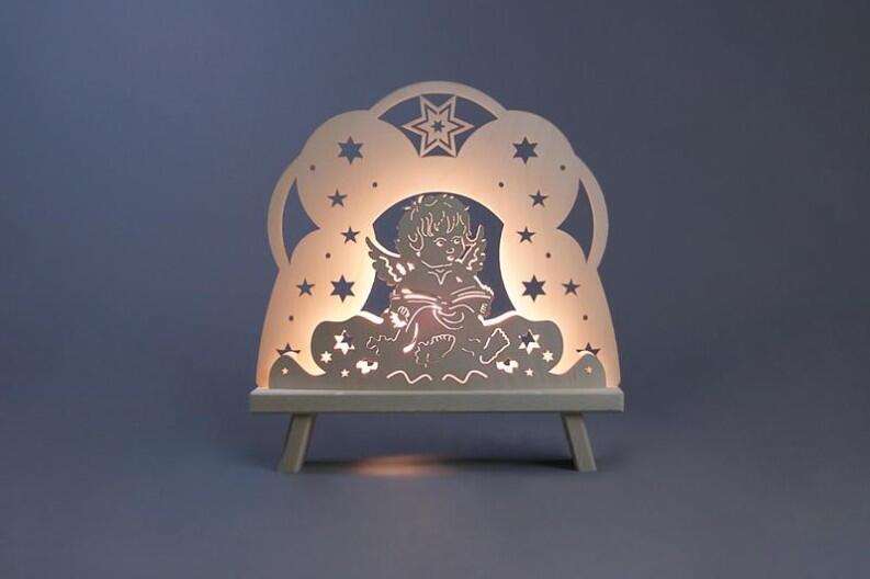Zarter Engel ruht in einer Wolke aus hellem Holz. Warmes Licht fließt sanft durch die Konturen und taucht den Raum in ruhige, behagliche Stimmung. Jede Linie spricht für echte Handarbeit aus dem Erzgebirge. Sanft leuchtet das Licht und bringt das filigrane Motiv besonders in der Dunkelheit zur Geltung.