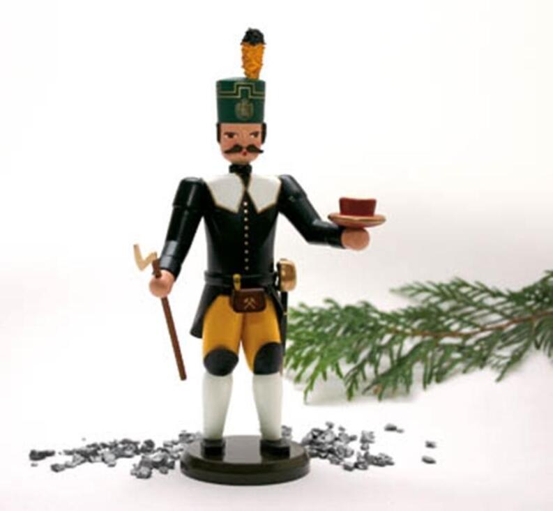 Holen Sie sich mit diesem farbenfrohen Bergmann ein bezauberndes Stück Erzgebirge in Ihre eigenen vier Wände. In liebevoller Handarbeit wird diese traditionsreiche Holzfigur in mehreren aufwendigen Arbeitsschritten im malerischen Seiffen gefertigt. Der detailverliebte Bergmann trägt eine farbenprächtige Uniform mit Arschleder und einem markanten grünen Hut mit Nackenschutz. In seinen Händen hält der stolze Steiger einen kunstvoll gestalteten Kerzenhalter, der für herkömmliche Pyramidenkerzen geeignet ist, sowie einen authentisch nachempfundenen Hacken mit Stab. Die Kombination von Volkskunst aus dem Erzgebirge und feinster Holzverarbeitung macht dieses Kunstwerk zu etwas ganz Besonderem.