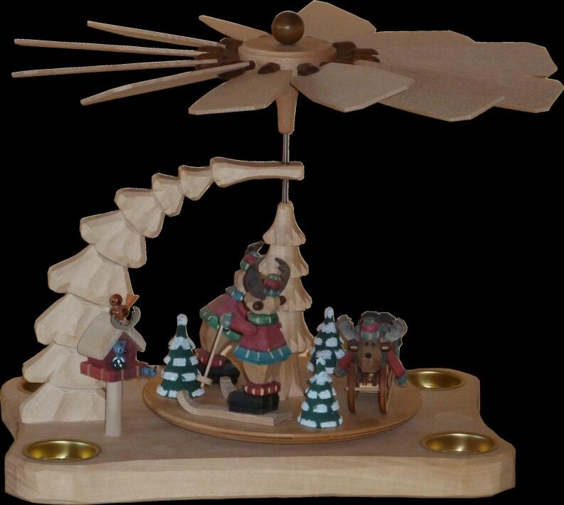Die handgefertigte Elchpyramide bringt die Magie des Erzgebirges in Ihr Zuhause. Der natürliche Holzton und die detailreichen Schnitzarbeiten machen diese Pyramide zu einem echten Blickfang. Die feinen Figuren zeigen einen Elch, der sanft dreht und dabei einen behaglichen Charme verbreitet.